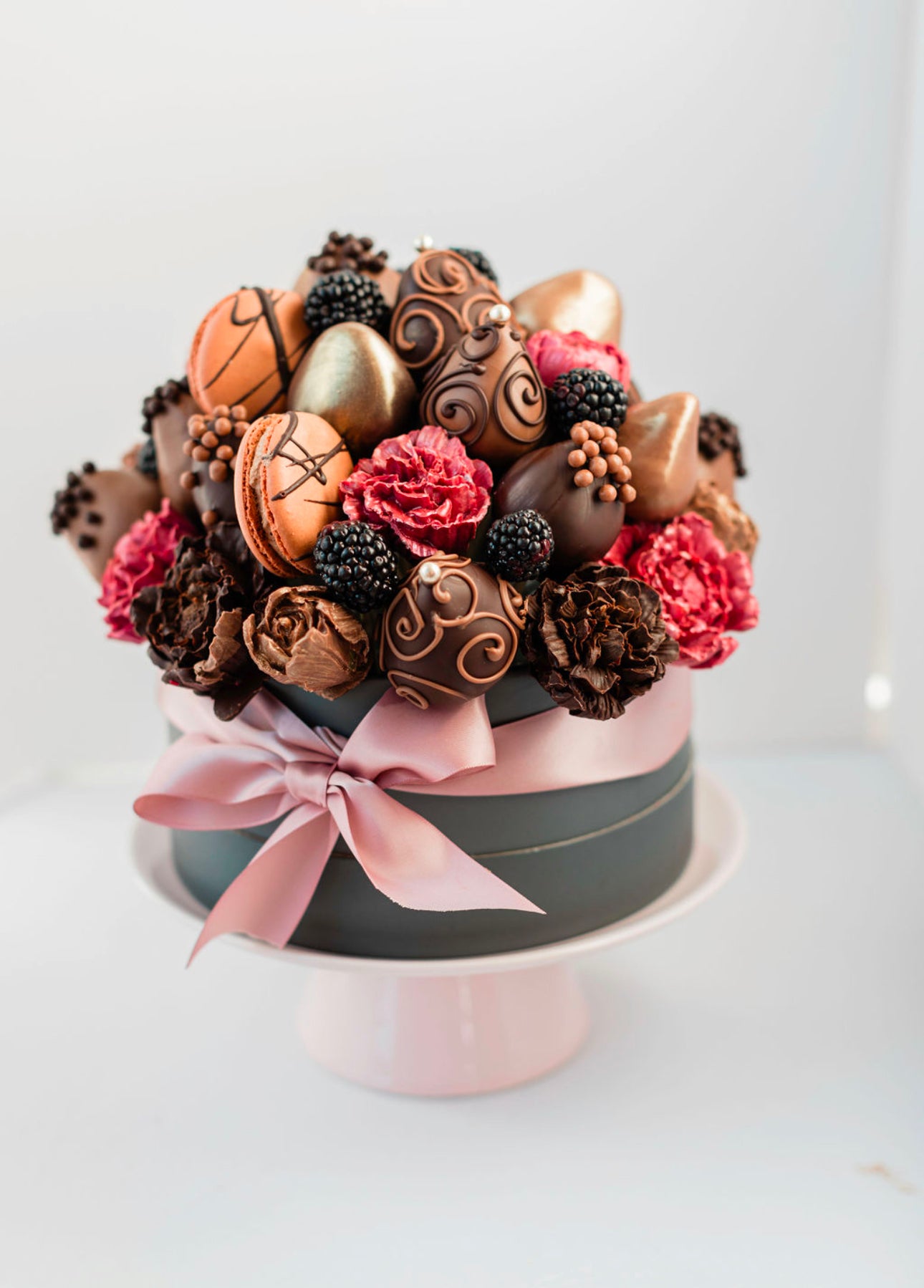 All of our arrangements our handmade, we will work within the theme you request however there may be slight modifications such as the way the strawberries are drizzled or the florals inside the arrangement. All orders are subject to availability.