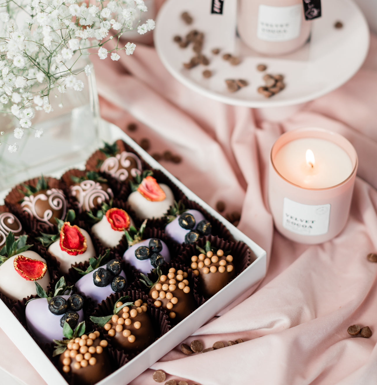 Our offerings go beyond desserts. We create custom gift baskets, offer corporate gifting solutions, and even develop exclusive products like chocolate-scented candles to elevate your gifting experience. No matter the occasion, we believe every gift should feel as special as the person receiving it.